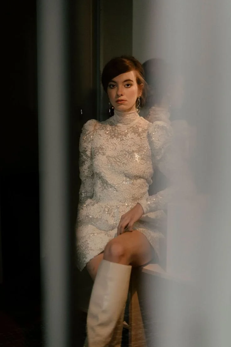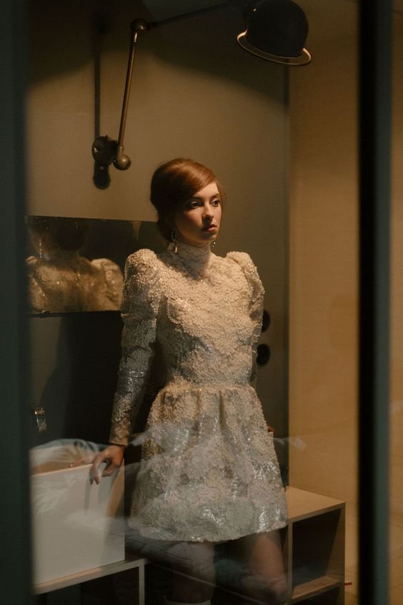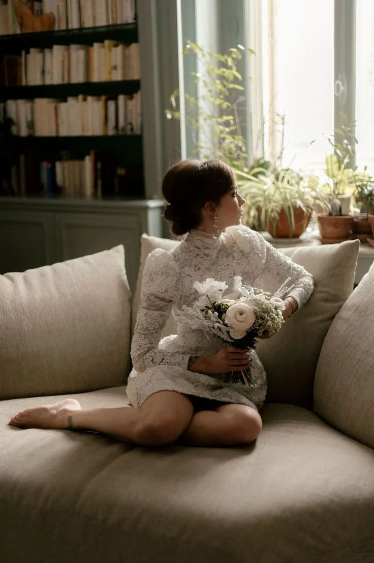 “Pour une mariée libérée, mes tenues sont légères et faciles à porter. J’aime imaginer des tenues du quotidien avec des détails couture et des matières élégantes. Pour ces deux modèles, je me suis inspirée de la mannequin, actrice et chanteuse Twiggy Lawson, icône des années 1960. J’ai détourné le pantalon dans une version jupe culotte en soie peau de pêche très en vogue dans les années 60 ainsi que la tendance mini avec cette robe à manche en dentelle épaisse et sequins argent en hommage aux robes Courrège.”